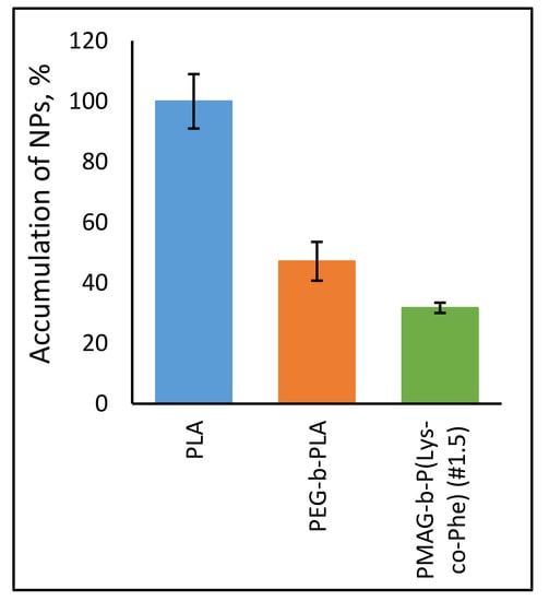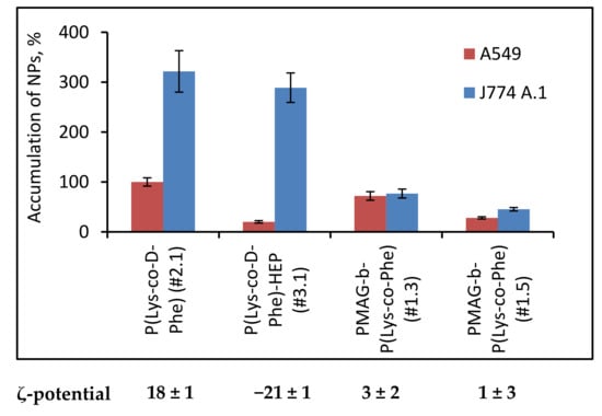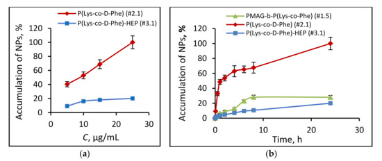 To compare the cellular uptake of particles with different fluorescence intensity, a parameter “accumulation” was introduced as a reference, which was defined as the cell fluorescence intensity Ifl cell divided by the fluorescence intensity of the particles (Ifl NPs). The values of accumulation for each point were calculated as a percentage of value obtained for the nanoparticles based on Cy3-labeled P(Lys-co-d-Phe) (sample #2.1) at the concentration of NPs of 25 μg/mL after 24 h of incubation or Cy5-labeled PLA at the concentration of NPs of 50 μg/mL after 6 h of incubation.