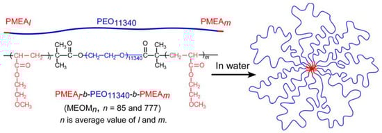 Amphipathic block copolymers form interpolymer aggregates because of the hydrophobic interactions of hydrophobic blocks in water [1]. Generally, amphipathic AB diblock copolymers form core–shell spherical polymer micelles in water. ABA triblock copolymers with two hydrophobic A blocks at both ends of the central B block form flower-like micelles caused by interpolymer aggregation in water [2]. The hydrophobic A blocks aggregate to form a core, and the hydrophilic B blocks form loop shape shells with a similar appearance to petals on the surface of the core to form flower micelles. The flower micelles are bridged when the hydrophobic A blocks in the ABA triblock copolymer are incorporated into separate cores in flower micelles. With increasing polymer concentration (Cp), the number of bridges between the flower micelles increases to form a gel [3]. The polymers increase the viscosity of the aqueous solution to form interpolymer aggregates, which can then be applied as associative thickeners with a small amount of addition [4]. For example, flower micelles formed from ABA triblock copolymers have been applied as associative thickeners [5]. Associative thickeners are used in water-based paints, coatings, personal care goods, and adhesive agents [6].