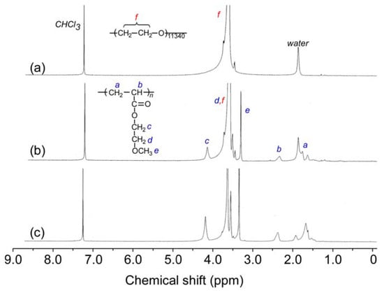 1H NMR spectra of (a) PEO-Br, (b) MEOM85, and (c) MEOM777 in CDCl3.