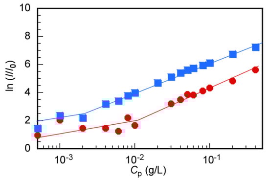 Light scattering intensity (LSI) ratio (I/I0) as a function of polymer concentration (Cp) for MEOM85 (●) and MEOM777 (■) in aqueous solutions; I0 is LSI of water, and I is LSI of the polymer solution.