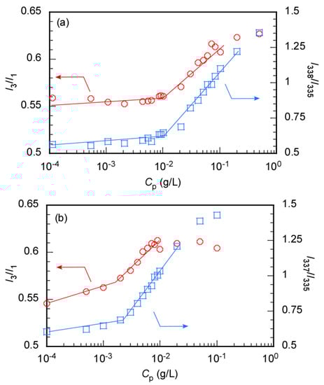 Pyrene fluorescence intensity ratio (I3/I1, 〇) and excitation intensity ratio (I338/I335, □) as a function of the polymer concentration (Cp) for (a) MEOM85 and (b) MEOM777 in aqueous solutions; I3 and I1 are the third and first vibronic peak intensities of pyrene fluoresce, and I338 and I335 are the peak intensities at 338 and 335 nm in the excitation spectra of pyrene.