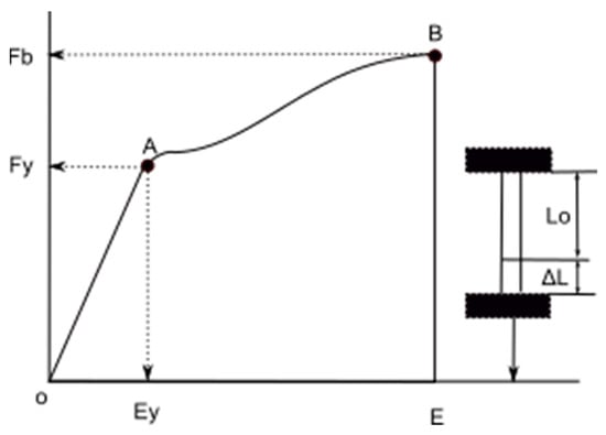 Material elongation at break (E) is defined as the elongation of a specimen corresponding to the force at the material break. When an external force is applied to a material, it is balanced by the internal force development in the material structure. A further increase in stress leads to deformation of the material, which is described by typical points (Figure 2). The region between points O and A (yield point) is the one where Hooke’s law is obeyed and is called elastic deformation. This is followed by the region between points A and B (plastic deformation), where the material deforms without the applied load increases. Point B is the breaking point where the material breaks irretrievably.