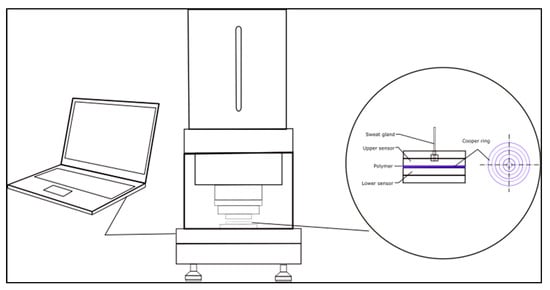 The parameters of moisture management were tested on the M290 moisture management tester (SDL Atlas, Rock Hill, South Carolina, USA) (see Figure 3) following the procedure described in a standard [41,42].