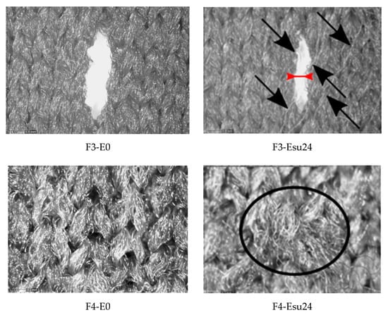 The examples of microscopic images of non-aged materials and materials aged according to Esu24 are given in Figure 4. The examples are given for specimens F3 and F4, which represent different structure types; the changes in the visual appearance are well perceived. From the images of both samples exposed to the sun, the increase in the surface fibrillation (additionally pointed out in the image using the black arrows) is seen. The primary reason for the splitting of the fibril bundles and their subsequent exposure to the surface is the conducted and repeated care process. This investigation was able to confirm the additional influence of exposure to the sun on the increase in fibrillation because the fibrillation was more prominent on the surface of materials exposed to the sun than those exposed to shade. The observation brings us to the conclusion that the conducted process of aging negatively affected the visual aspect of the material surface. This phenomenon should further lead to consumer dissatisfaction with the material appearance. The images also illustrate the change in the dimensions of voids within the structure, which is especially well seen if the specimens F3-E0 and F3-Esu24 are compared. The decrease in the void width is marked on specimen F3-Esu24 using the red arrow. For these particular cases, the maximal width of the unexposed specimen (i.e., F3-E0) is 0.794 mm; the maximal length of the void of the specimen exposed to the sun (i.e., F3-Esu24) is 0.442 mm. Regarding the length of the observed voids, the decrease is also confirmed after the exposure to the sun (for example, the length of the void of the unexposed specimen F3 is 2.894 mm, while the length of the specimen F3 exposed to the sun is 2.569 mm). These observations lead to the conclusion that the aging of materials has caused the material shrinkage in both dimensions (i.e., lengthwise and widthwise).
