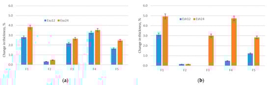 The results of thickness testing (Figure 5) revealed the increase in thickness due to exposure to the sun for all investigated materials. As can be seen, the thickness of materials increases after the exposure to Esu12 (increase is 0.4–3.1%) and continues to increase after exposure to Esu24, (the increase is 0.5–3.9% in comparison to the primary thickness). The main reason for the increase in material thickness is the material shrinkage confirmed in the previous section, which for a range of elastic materials with an unstable structure, directly affects the change of the observed property.
