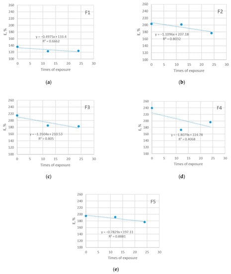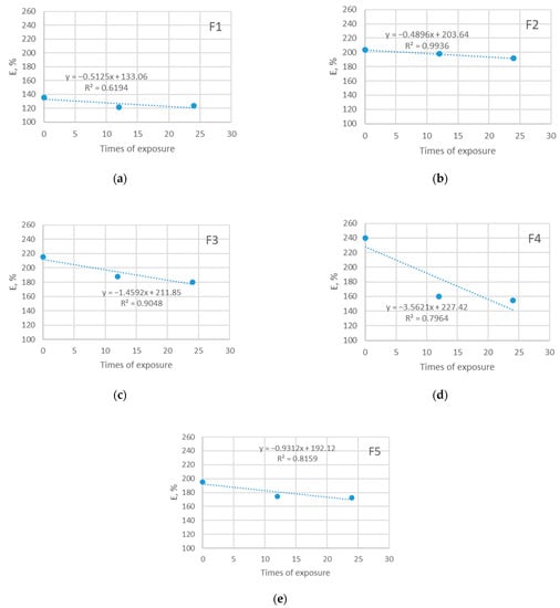 Breaking elongation of five investigated materials exposed in shade: (a) F1; (b) F2; (c) F3; (d) F4; (e) F5.