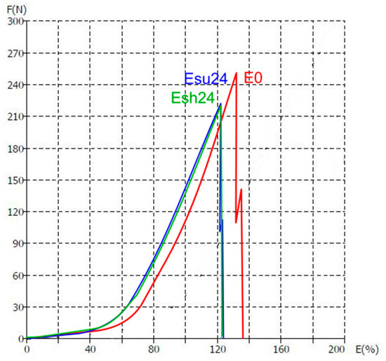 Figure 9 gives the typical F/E curves for the specimen F1 in conditions E0, Esu24, and Esh24. It can be seen immediately that the yield elongation for non-exposed material is slightly higher than for exposed to aging material. It corresponds to an estimated elongation of 50% for non-exposed and 40% for exposed materials. Breaking elongation for non-exposed material is 135.84% and is 9% higher than for exposed materials. When we look at forces, there are no significant differences for yield forces; however, there is a difference in breaking force. For non-exposed material, it is 254.64 N and is on average 12% higher than the force for exposed materials. Interestingly, the values for exposed materials are uniform and there is no significant difference between material exposed to the sun from material aged in the shade.