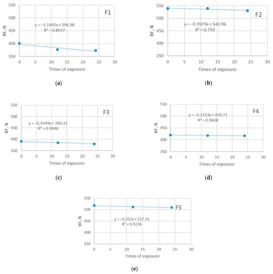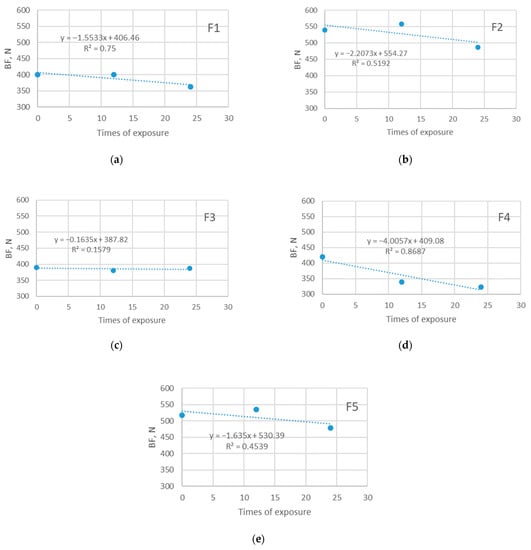Bursting force (BF) of five investigated materials exposed in sun: (a) F1; (b) F2; (c) F3; (d) F4; (e) F5.