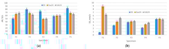 Interestingly, a substantial disagreement between the periods of exposure and measured breaking forces is seen for the specimens exposed to Esh12 and Esh24. The results presented in Figure 11 show a slight increase in bursting force after exposure to Esu12 for three out of five specimens, which cannot be related to the structure, thickness, or Aiy. Still, the finally measured bursting force (i.e., the bursting force measured after Esh24) decreases in all cases and is lower than the bursting force of the unexposed specimens. The apparent lack of correlation between the time of exposure and bursting force is confirmed by linear regression equations (the relation is strong for one specimen only—R2 for the F4 is 0.8687).