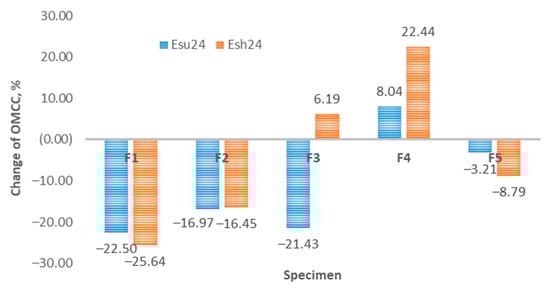 Figure 13 shows the comparative aging results after Esu24 and Esh24 and their impact on the total moisture management capacity (OMMC) for specimens F1-F5. The greatest effect of aging on the OMMC index is seen on specimens F1 and F2, in the percentage ranges of 16% to 26%, and with minimal difference in relation to aging Esu24 and Esh24. This means that the impact of solar radiation on the OMMC index on these two samples is minimal compared to shadow aging. The aging results on sample F3 are contradictory. Namely, sun exposure (Esu24) shows a decrease in the OMMC index of approximately 20% (same range as for samples F1 and F2), while shadow aging (Esh24) shows an increase in OMMC index by 6%. Sample F4 shows an increase in the value of the OMMC index after exposure to aging—an 8% increase after Esu24 aging and a 22% increase after Esh24 aging. The change in the percentage of OMMC for sample F5, after the aging process, shows a decrease of 3–9%, with a greater decrease after Esh24 aging. The measurement results for samples F1, F2, F3, and F5 show a decrease in the percentage of OMMC index after Esu24 aging. Interestingly, the increase was detected only for sample F4 (after Esu24 and Esh24) and for sample F3 only after Esh24. This increase in OMMC for specimens F4 and F3 (Esh24 only), may be associated with a significant increase in thickness (compared Esh12 and Esh24) for specimens F3 and F4. Figure 5 shows a significant increase in thickness as a result of Esh24. Higher thickness increased the absorption rate of specimen AR, and thus OMMC.