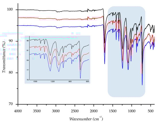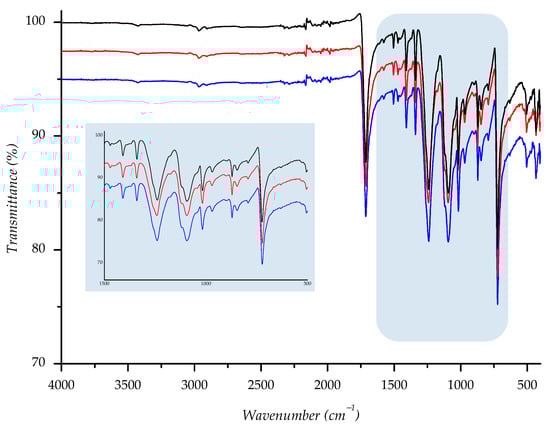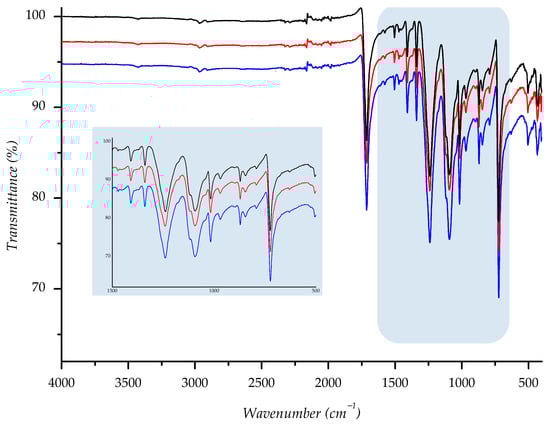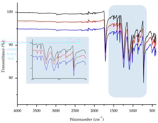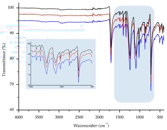 IR spectra of investigated sample F2 ((—) = starting material; (—) = material aged in sun; (—) = material aged in shade) with enlarged fingerprint region (colored in blue).