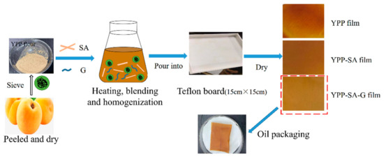 The yellow peach peel was dried in an oven at 50 °C for 12 h, ground into flour by a high-speed mill (Shanghai, China) and then passed through a 200-mesh sieve. Figure 1 showed a schematic diagram of the film-forming process. Firstly, the YPP flour was dispersed in 100 mL of water and stirred at 60 °C for 30 min to ensure thorough mixing. Then, the film-forming solution was further processed using a high-pressure homogenizer (GJJ-0.03/100, Shanghai Noni Light Industry Machinery Co., Ltd., China) at a pressure of 40 MPa. Next, SA and G were added to the dispersion, stirred using a thermomagnetic mixer (Beijing, China) for 30 min and then degassed using a vacuum pump for 10 min. Finally, 100 mL of film-forming solution was poured into a 15 cm × 15 cm Teflon plate, the film was removed from the plate after drying at 50 °C for 5 h and incubated at 25 °C and relative humidity (56% RH) for 24 h to further evaluate the physical properties of the film.