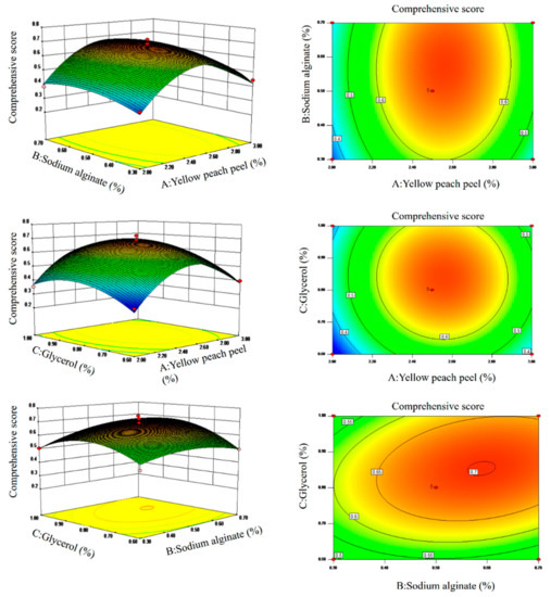 To analyze the experimental data, Design Expert 8.0.6 software was used to design according to the Box-behnken design (BBC), which required 17 experiments including five replicates formed at the center point. To predict the optimal point, a second-order polynomial function was established to evaluate the relationship between the yellow peach peel, sodium alginate, and glycerol concentrations and the composite score of the film.