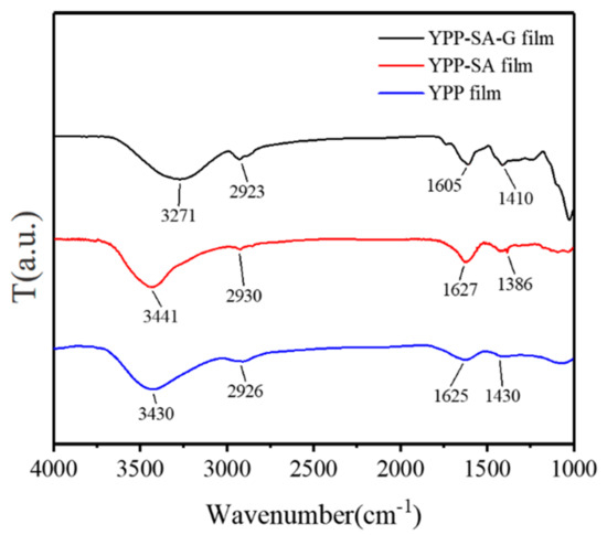 In particular, after adding G, the peak at 3441 cm−1 in the spectrum of the YPP-SA film was observed to shift to 3271 cm−1 compared to the addition of SA in the optimized YPP-SA-G film. At the same time, the peak at 1625 cm−1 shifts to a lower wavenumber at 1605 cm−1 in the YPP-SA-G film, and a strong band appears at about 2923 cm−1 from the CH (saturation) stretching of the glycerol chain, which indicates that the hydrogen bonding interactions between the blend components are stronger than the corresponding self-associative hydrogen bonds of pure polymers [40]. Therefore, YPP-SA-G films have better mechanical properties.