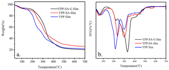 (a) TGA and (b) DTG curves of various films (YPP, YPP-SA, YPP-SA-G).