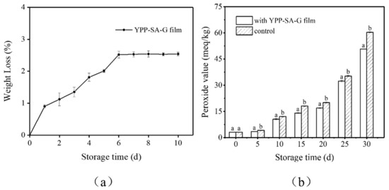 (a) Weight loss of oil bags made from YPP-SA-G film for 10 days storage; (b) The changes in peroxide value of soybean oil during 30 days storage.