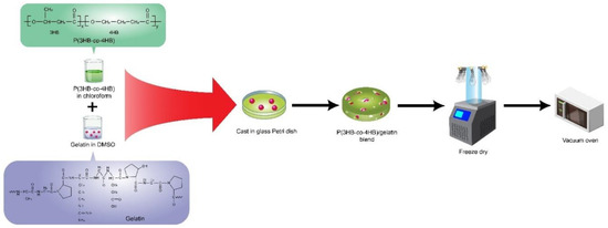 The P(3HB-co-4HB)/gelatine blend scaffolds were prepared using a combination of two different solvents: chloroform and dimethyl sulfoxide (DMSO). The blend scaffolds were prepared according to such parameters as the percentage of gelatin (7.5, 10 wt.%), 4HB monomer composition (27 mol%, 50 mol%, 82 mol%), and the final weight of blend scaffolds (0.79 g and 0.4 g). The P(3HB-co-4HB) copolymer was dissolved in chloroform (20 mL) while gelatine powder from cold fish skin (Sigma Aldrich, USA) was dissolved in DMSO (6 mL). Both solutions were stirred separately to ensure both polymers had completely dissolved. Then, the solutions were combined, stirred for 1 h, and carefully poured into the glass Petri dish (9 cm). The cast scaffold was washed with distilled water, freeze-dried (−75 °C) for 48 h, and later kept in a vacuum oven till further use, as shown in Figure 1 [36]. However, the highest gelatine concentration of only 7.5 wt.% could be incorporated to P(3HB-co-82mol%4HB) as a higher concentration disrupted the shape of the scaffolds.