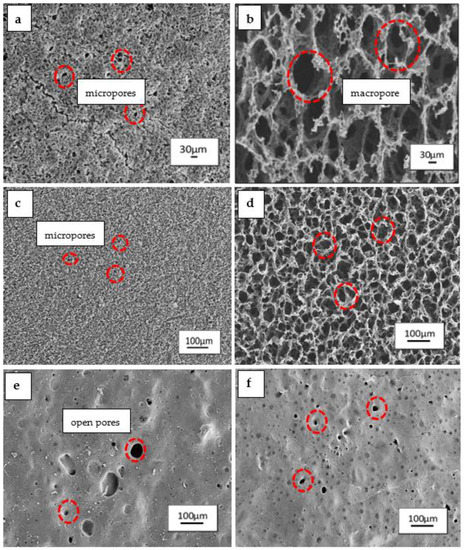 Surface morphology of P(3HB-co-4HB)/gelatine blend scaffolds with final weight of (a) 0.79g-(P27mol%G10); (b) 0.4g-(P27mol%G10); (c) 0.79g-(P50mol%G10); (d) 0.4g-(P50mol%G10); (e) 0.79g-(P82mol%G7.5); (f) 0.4g-(P82mol%G7.5).