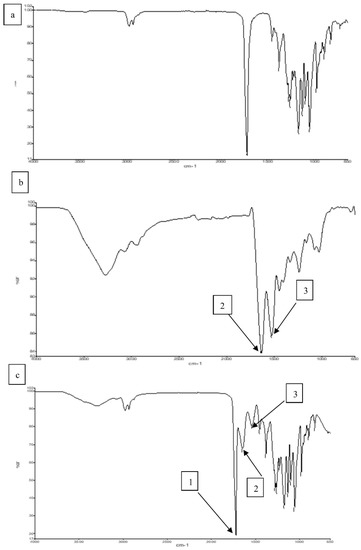 FTIR spectra of (a) P(3HB-co-4HB), (b) Gelatine (c) P(3HB-co-4HB)/gelatine blend scaffolds. Arrow 1, 2 and 3, indicate the ester group, amide I and amide II, respectively.
