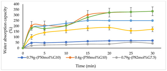 Water absorption by materials indicates the hydrophilicity of the material in terms of the amount of water absorbed. Figure 4 demonstrates that the water absorption capacity of P(3HB-co-4HB)/gelatine blend scaffolds. Based on the results, the final water absorption is in the order of 0.4g-(P50mol%G10) > 0.4g-(P27mol%G10) > 0.79g-(P27mol%G10) > 0.4g-(P82mol%G7.5) > 0.79g-(P50mol%G10) > 0.79g-(P82mol%G7.5). The 0.4g-(P50mol%G10) showed the highest water absorption capacity with 325% as compared to the other scaffolds. Meanwhile, the improvement of water absorption capacity in this study can be correlated to the porosity of the blend scaffolds (Table 2) as previously described [37]. Gelatine will form a gel at low temperature and this allows for better absorbance of water [24,25,26,27,28,29]. Therefore, the hydrogel scaffold can absorb and retain water well. Hence, based on the results obtained, although P(3HB-co-4HB) is known to exhibit poor hydrophilicity, the scaffolds in this study have combined properties of both hydrogel and porous structures based on their high-water absorption capability. A similar observation was seen in a previous study where gelatine enhanced the swelling capacity of 250–260% in PLA/gelatine blend hydrogels deemed super absorbent [24]. This result suggested that 0.4 g-(P50mol%G10) was desirable as cell culture matrices for tissue engineering in the future [53].
