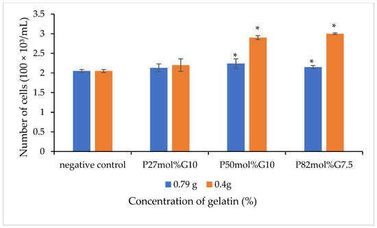 The in vitro cell culture study was carried out to investigate the effect of blend scaffolds on the L929 murine fibroblasts cell line. The L929 cell line was seeded on the surface of scaffolds for 72 h and an MTS assay was carried out to determine the cell growth on the scaffolds. Figure 4 shows the number of cells that grew on the P(3HB-co-4HB)/gelatine blend scaffolds. Based on the results obtained in Figure 5, it is evident that the fabricated blend scaffolds did not exhibit any cytotoxicity and are able to support cell attachment and proliferation of L929 fibroblasts. From these results, the number of L929 fibroblasts cells increased as compared to the initial seeding. Based on the results, the highest cell proliferation was observed in 0.4 g-(P50mol%G10). The thickness of scaffolds greatly influenced the cell growth, whereby the thin scaffolds (those with final weight of 0.4 g) had a higher cell proliferation as compared to scaffolds fabricated with a final weight of 0.79 g. A similar trend is observed in a previous study, where the cell proliferation rate of P(3HB-co-4HB)/collagen peptide blend film showed that the L929 cell line grew better with a reduction of thickness from 0.2 mm to 0.1 mm [14]. The thickness of a scaffolds is crucial, especially in wound dressing, and porous collagen–chitosan scaffolds with a thickness of less than 1 mm were found to be ideal for dermal regeneration [54,55,56,57,58,59]. Apart from that, the 4HB monomer composition also influenced cell growth on scaffolds. The P(3HB-co-50 mol% 4HB) and P(3HB-co-82mol% 4HB) exhibited a higher number of cells compared to P(3HB-co-27mol% 4HB). It was apparent that the presence of gelatine, film thickness, and 4HB monomer composition enhanced cell proliferation and growth.