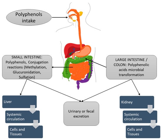 However, EPIC and PREDIMED studies [6,10] have shown that large quantities of polyphenol-rich foods must be taken with the diet to have a visible effect on health. Indeed, the polyphenol bioavailability is very low due to the lower absorption from the intestine, the extensive gut transformation, and the rapid clearance from the body. Once ingested, polyphenols, similar to many xenobiotics, undergo several transformation processes such as glycosylation, methylation, glucuronidation, and sulfation, which reduce their potential toxicity, limiting their diffusion across barriers in the gastrointestinal tract and facilitating their biliary and urinary elimination by increasing their hydrophilicity (Figure 1) [29]. Several polyphenols available as glycosylated compounds present a low diffusion across barriers in the gastrointestinal tract. Polyphenols are extensively transformed via phase II pathways, predominately methylation, glucuronidation, and sulfation in the enterocytes of the small intestine, and then further metabolized in the liver, facilitating their quick excretion. Additionally, polyphenols are secreted via the biliary route into the duodenum, where they are transformed by bacterial enzymes such as glucuronidase, and reabsorbed in cells and tissues or excreted.