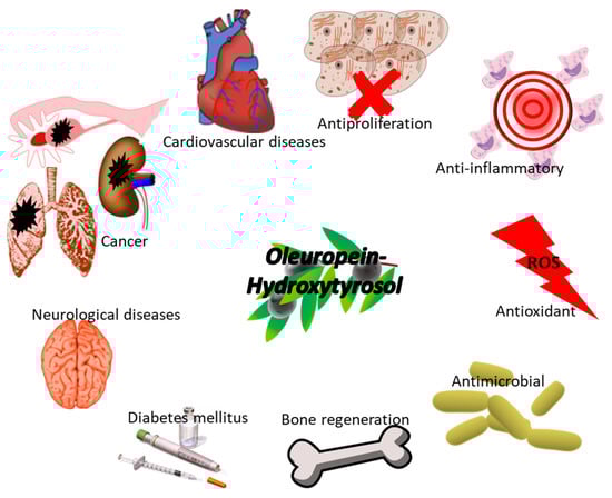 The main beneficial health effect of oleuropein (OLE) and hydroxytyrosol (Htyr) are summarized in Figure 3.