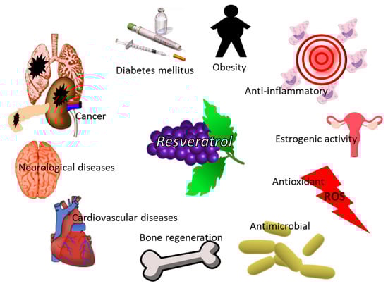 RSV sources are not only grape skins, but also berries, peanuts, and cocoa and it is synthesized to protect the plant from the attack of bacteria and fungi. There are two resveratrol isomers, cis- (Z) and trans- (E), and both have been detected in wine at concentrations ranging from 0.1 to 7.0 mg/L and from 0.7 to 6.5 mg/L, respectively [96]. Resveratrol bioactivity was related to antioxidant, neuroprotective, anti-inflammatory and anti-obesity effects and to its influence in controlling blood glucose and cardiovascular complications [101]. Moreover, it was demonstrated that dental material loaded with RSV represented a promising solution for the prevention of implant-associated infections, since the developed biomaterial was able to affect the colonization of Pseudomonas aeruginosa and Streptococcus mutans, bacteria responsible for both acute and chronic infections in humans [102].