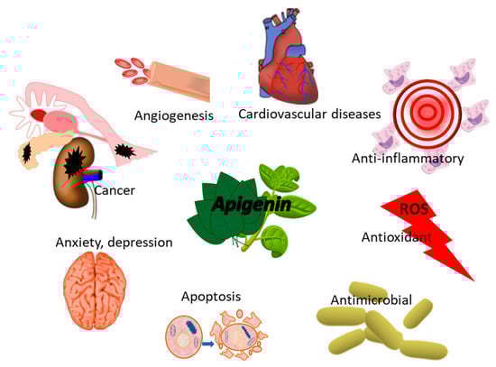 - Ashrafizadeh, M.; Bakhoda, M.R.; Bahmanpour, Z.; Ilkhani, K.; Zarrabi, A.; Makvandi, P.; Khan, H.; Mazaheri, S.; Darvish, M.; Mirzaei, H. Apigenin as Tumor Suppressor in Cancers: Biotherapeutic Activity, Nanodelivery, and Mechanisms with Emphasis on Pancreatic Cancer. Front. Chem. 2020, 8, 829. [Google Scholar] [CrossRef] [PubMed]