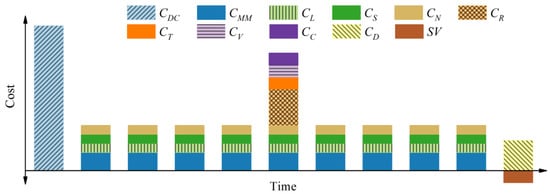 The LCC of a bridge is the sum of all costs that are incurred throughout the bridge’s whole life. These costs can be classified into three categories, and each category can be further divided into several items, which are shown in Table 1 [19,24].