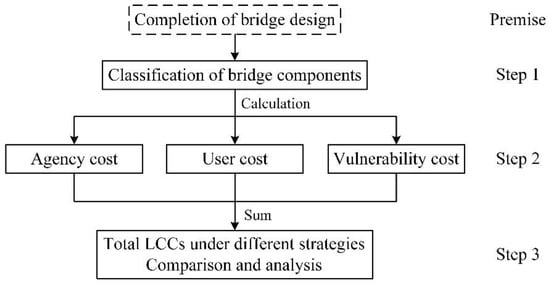 The premise of performing life-cycle cost analysis (LCCA) is the completion of bridge design. The first step of LCCA is the classification of bridge components. In this step, the service life and replacement times of all bridge components are ascertained. Then, the agency, user, and vulnerability costs under different bridge construction and maintenance strategies are calculated. Finally, these three types of costs are added up, and the total LCCs under different strategies are compared and analyzed. The flowchart of LCCA is shown in Figure 2.