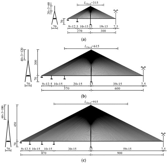 The investigated cable-stayed bridges have double pylons, double cable planes, and three spans. Their main spans are 600 m, 1200 m, and 1800 m, respectively. Thus, they essentially cover the current feasible span range of long-span cable-stayed bridges. The height–span ratio was set to 0.25. Therefore, the heights of the pylons above the girder axes are 150 m, 300 m, and 450 m, respectively. Furthermore, the heights of the pylons below the girder axes are 70 m, so as to meet the navigation requirements. The overall layouts of the three bridges are shown in Figure 3.