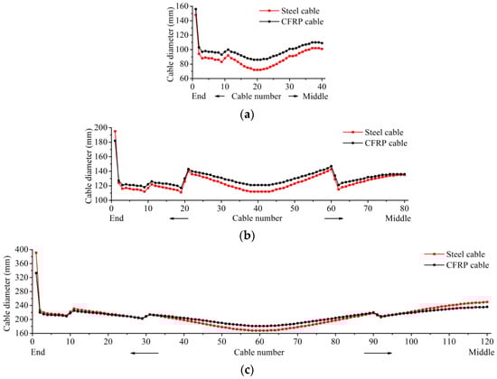 As seen in Figure 4, the distributions of cable diameters for the CFRP or steel cable-stayed bridges are similar—that is, the stay cables at the side span ends are relatively thick, and the cable diameters suddenly increase near the auxiliary piers. Furthermore, the cable diameters of the CFRP cables are all greater than those of the corresponding steel cables when the main span is 600 m; however, they become close to or even smaller than those of the steel cables when the main span is 1200 m. Moreover, when the main span reaches 1800 m, about half of the CFRP cables become thinner than the steel cables. This is mainly because the axial stiffness—i.e., the equivalent elastic modulus—of CFRP cables is smaller than that of steel cables when the main span of the bridge is only 600 m, and more CFRP materials must be used to achieve enough structural stiffness. However, when the main span increases to a sufficient length (e.g., 1800 m), the equivalent elastic moduli of many CFRP cables become equal to or even greater than those of corresponding steel cables, which helps to make full use of CFRP’s high strength, thus saving cable materials.