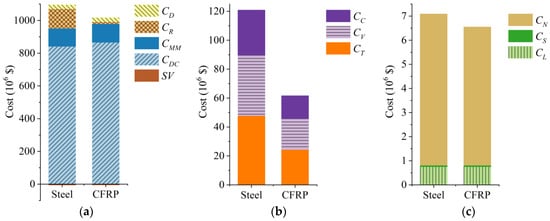 The detailed life-cycle cost results of the investigated cable-stayed bridges are listed item by item in Table 11, which refers to the typical case that the unit price of CFRP cable is USD 50/kg and the steel cables will be replaced every 25 years. These costs are all present values. Furthermore, taking the main span = 1200 m as an example, these costs from steel or CFRP cable-stayed bridges are drawn category-by-category in the column figures for a more graphical comparison (Figure 6).