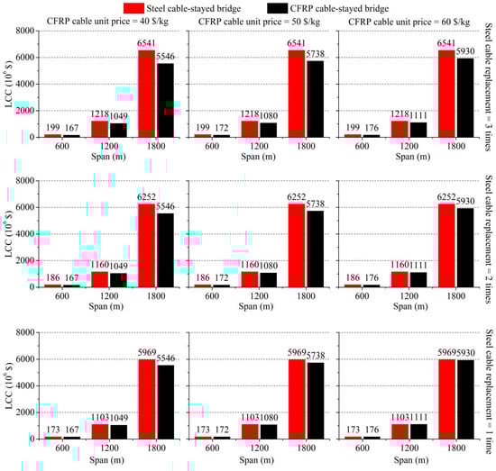 In addition to the span, the influences of other two factors—i.e., CFRP cable unit price and steel cable replacement frequency—were also investigated. Usually, bridge construction decision makers pay more attention to the total LCC. Furthermore, the proportion of each cost item in total LCC does not change significantly with the variation of these two factors compared to the values in Table 11 and Figure 6. Therefore, only the comparisons of total LCCs are presented hereafter.