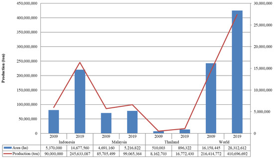 World area that was harvested and oil palm production within the predominant three countries in Southeast Asia during 2009–2019, Indonesia, Malaysia, and Thailand [12].