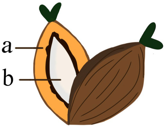 Cross-section of an oil palm fruit that is comprised of (a) an outer oily flesh or pericarp (consisted of exocarp, mesocarp, and endocarp) and (b) an oil-rich seed/nut or kernel (endosperm).
