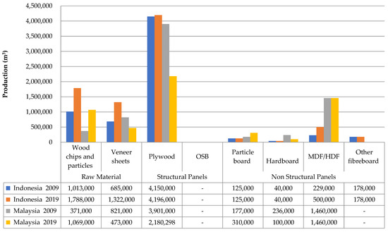 Data production of wood-based panels of Indonesia and Malaysia in a decade (2009–2019) consisting of raw material (wood chips and particles and veneer sheets), structural panels (plywood & OSB), and non-structural panels (particleboard and fiberboard) [12].