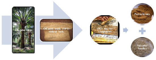 The oil palm plant is not a woody plant. The oil palm is a monocotyledonous species; it lacks cambium, secondary growth, growth rings, ray cells, sapwood, heartwood, branches, and knots. Oil palm has an anatomical structure that is composed primarily of fibers, tracheids, vessels parenchyma, and ray parenchyma cells. OPT differs chemically from hardwood/softwood species, with differences in cellulose, hemicellulose, and lignin content [89].