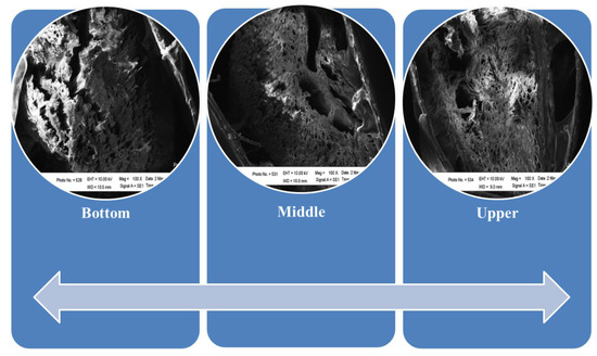 Picea abies (Norway spruce), a softwood species, has a different anatomy than the oil palm plant. Since it is a softwood, it contains earlywood (EW) and latewood (LW), which are readily visually visible. The LW is denser than the EW, and when viewed under a microscope, the cells of dense latewood have very thick walls and tiny cell cavities, whereas those of EW have thin walls and large cell cavities [99]. Macroscopically, the spruce wood consists of sapwood and heartwood whereas microscopy works revealed that wood was also arranged by tracheids which are typically ordered in a regular pattern and are nearly perfectly rectangular in cross-section [100]. Further, in spruce wood, abnormality in growth such as formation of hazel wood could be occurred [101]. In OPT, there is no differences among the bottom, middle or upper parts as shown in the scanning electron microscopy (SEM) image of Figure 6.