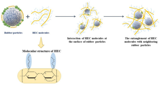 Proposed model for the structures of creamed latex with the incorporation of HEC molecules at the surface of rubber particles.