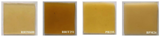 The color of all clones selected were determined with a Lovibond colorimeter and HunterLab spectrophotometer, and they are summarized in Table 3. A photo of the rubber sample is also shown in Figure 1. The yellow color of NR is not only due to the presence of non-rubber constituents but also depends on clonal and seasonal variations, soil types and tapping frequency. The distinctive yellow color in NR has been attributed to the presence of carotenoids. Mostly, the non-rubber components affect the color of products made from it. Therefore, the color change of the samples is likely to arise from the oxidation of non-rubbers such as proteins and lipids [19].