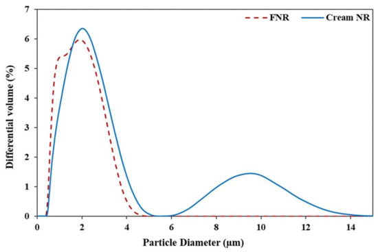 Particle size distribution of the fresh natural latex and cream concentrated latex from the RRIM600 clone.