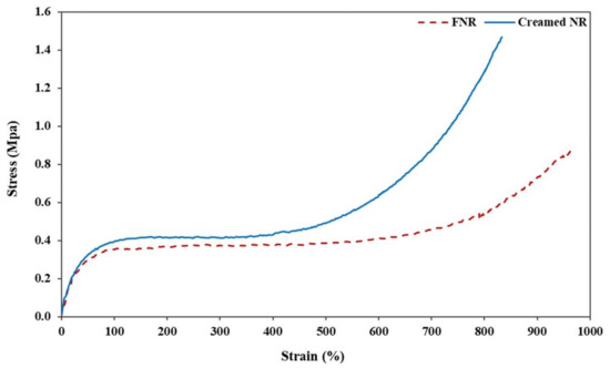 Stress-strain curve of fresh natural latex and cream concentrated latex from RRIM600 clone.