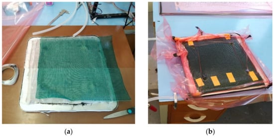 Boards for testing purposes were made from these materials via the Vacuum Infusion (VARTM) method [,], which is widely used for production of high-quality composites with all types of weaving, and guarantees constant conditions of saturation, curing, control, and processing. Examples of the board production process are shown in Figure 1a,b. LG700 epoxy resin with HG700 hardener (as used by the manufacturer—GRM Systems, Olomouc, Czech Republic) were used for the matrix; this is suitable for Resin Transfer Moulding (RTM) and infusion applications. The resin is used in a weight ratio of 100:30. The mechanical properties of the unreinforced resin are tensile strength of 65–75 MPa, elongation at break of 6–8%, and flexural strength of 110–120 MPa []. All the samples were cured at 24 °C for 24 h before demoulding. The samples were cut after five days, and no additional post-cure process was required.