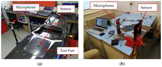 Evaluations of RMS (Root Mean Square) mechanical vibration, noise levels, and dynamic properties were also made to find out the most suitable composite material for the Electric Personal Watercraft. Measurement of FRF (frequency response function) was chosen to evaluate dynamic properties of the samples. Modal analyses were not performed because investigating the samples’ mode shapes was more suitable to compare the results of real measurements with mathematical models. Brüel & Kjaer Photon + equipment was used to perform the experimental measurements (see Table 3). The FRFs measurements were performed in laboratory conditions. A bench vice was used to clamp the composite samples (see Figure 2b). Keeping identical positions of samples in the vice, the position of accelerometer and hits by modal hammer were emphasized when exchanging the samples. The 4517-type accelerometer was chosen since its low weight does not affect the FRFs results and low sensitivity prevents sensor overloading. Each FRF peak represented a frequency the system in which vibrated excessively. This function could be used to calculate Young’s modulus, loss factor, and damping ratio at different resonant frequencies of each specimen [].