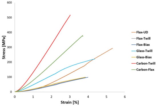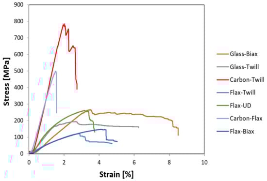 However, differences are more evident from Figure 5, showing graphical depictions of the tensile tests results, i.e., stress-strain curves, the tensile moduli from which were derived. As for the glass materials, the tensile strength was higher for the biaxial fabric, but the shapes and slopes of the curves revealed that their tensile moduli were comparable. This phenomenon is well-described in the literature and is typical for composite materials, the value of tensile modulus for which is not entirely meaningful without knowing the shape of the stress-strain curve. For example, Zhang [] documented such mechanical behaviour for glass–flax hybrid materials. In regards to the other materials, the results for the carbon composites and hybrids were evidently the most advantageous, while the lowest values were achieved for the flax (note that the courses of the load curves for the fabric and biaxial materials were almost identical). The values of strain were primarily given by the composition of the samples, which was quasi-isotropic. Therefore, the strain was of higher values for the one-way samples, or samples arranged in ideal directions. All the evaluated samples experienced final fracture, as can be seen from the curves in Figure 5.