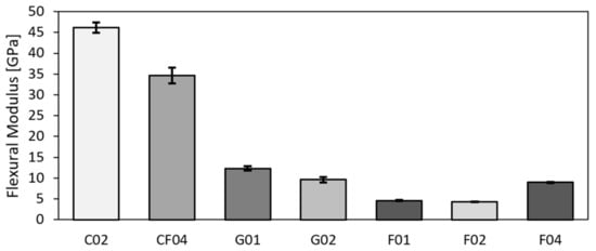 The values acquired based on the three-point bending test, i.e., flexural modulus, flexural strength, and flexural strain, are given in Table 5. The values are again the arithmetic means from five samples with the standard deviation N = 5. Similar to the tensile test results, the carbon sample, together with the hybrid one, exhibited the highest values. However, the hybrid and glass samples exhibited differences. The values for the hybrid sample corresponded to those acquired for the carbon ones, while the values for the glass reached similar values as for the flax (see Figure 6 depicting the tensile strengths and Figure 7 showing the tensile moduli). The results from three-point bending testing reveals that the glass fabric exhibited very low flexural strength—compare 183 MPa to 760 MPa acquired for the carbon and 463 MPa reached for the hybrid fabric, respectively. The trend was similar also for the flexural modulus—compare 12.30 MPa for glass, 46.12 MPa for carbon, and 34.63 MPa for hybrid carbon–flax materials, respectively. Similar values for comparable materials were reported by others [,,]. The comparison of the results also shows that the flexural strength and moduli acquired for the flax UD were comparable to those acquired for the glass bi-axial fabric.