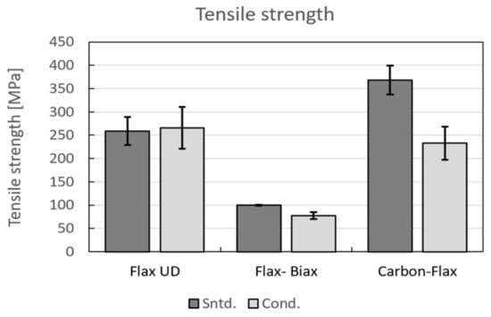 From the tensile tests, the results of which are summarized in Figure 9, it is evident that the standard deviation increased for all the flax samples. Moreover, the change in tensile properties was minimal except for the hybrid composites, for which values 28% lower were achieved (compared to standard samples). This can mainly be attributed to the effect of moisture on materials’ interface, i.e., location in which failure was initiated. These conclusions are supported by study [] reporting a correlation between increase in material thickness, decrease in mechanical properties, and occurrence of failure.