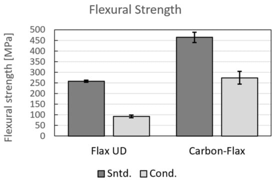 The UD flax material and hybrid fabric were tested by the three-point bending test (see Figure 10 for the flexural strength results). Similar to the tensile test results depicted in Figure 9, the results of bending tests showed that moisture decreased properties of the hybrid material. However, the decrease in the values achieved for the Flax UD sample was even more noticeable (more than 60%). Comparable results were acquired by César dos Santos et al. [], who achieved the flexural strength of 248.02 ± 26.24 MPa for a longitudinal specimen, and the flexural strength of 77.93 ± 8.25 MPa for a specimen placed for four days in a 100% humidity environment (which is in agreement with the herein performed experiment). In the presented study, the hybrid fabric still exhibited higher values given by the carbon layer. The core itself behaved as a sandwich structure primarily loaded by shear stress. Therefore, the drop in the flexural values was not as large as for the flax UD sample [].